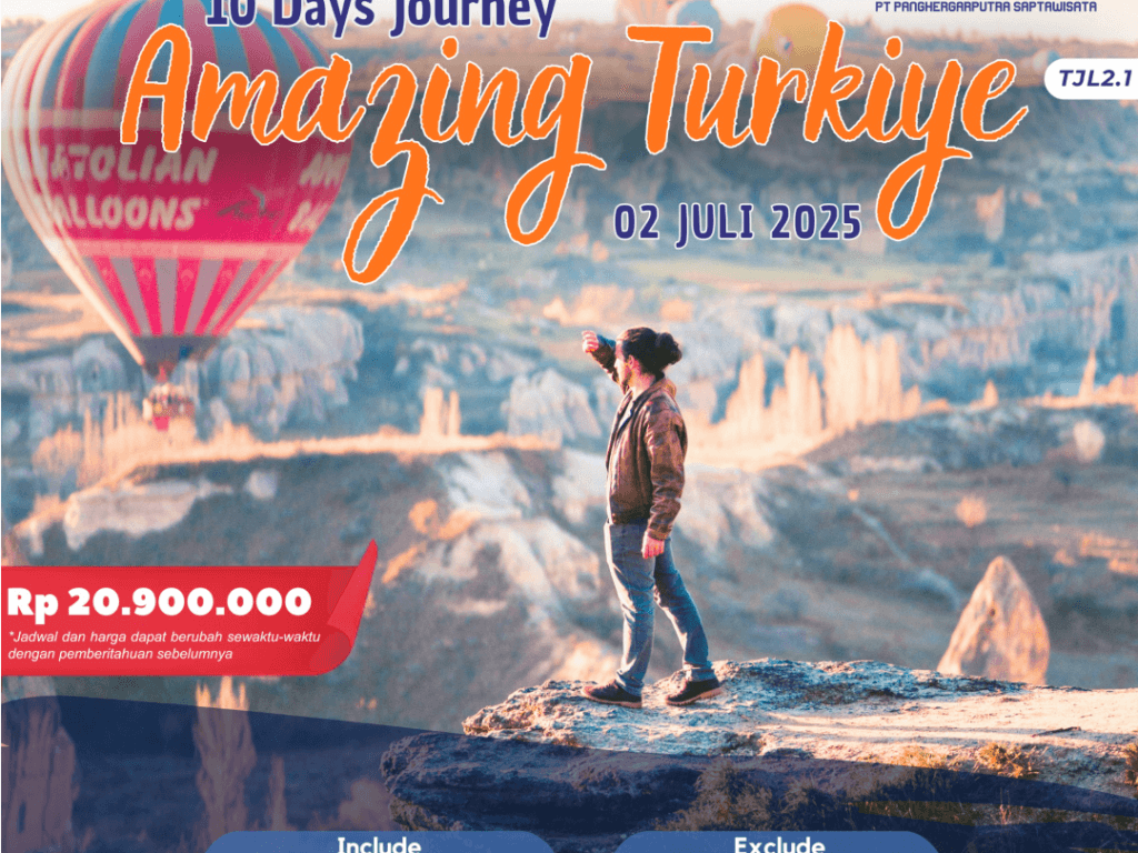 Highlight : Tophane Clock Tower, Alacati Greek Town, Sirince Village, Hierapolis Ancient City, Cotton Castle, Sultanhani Caravanserai, Underground City, Goreme Valley, Pigeon Valley, Uchisar Castle Village, Salt Lake, Ataturk Mausoleum, Blue Mosque, Hippodrome Square, Topkapi Palace, Hagia Sophia Mosque, Grand Bazar, Bosphorus Cruise, Taksim Square, Jalan Istiklal.